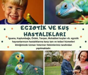 İguana, Kaplumbağa, Ördek, Tavşan, Muhabbet kuşları vb. egzotik hayvanların hastalıklarına karşı tanı ve tedavi hizmetleri kliniğimizde Uzman Veteriner Hekimlerimiz tarafından yapılmaktadır.